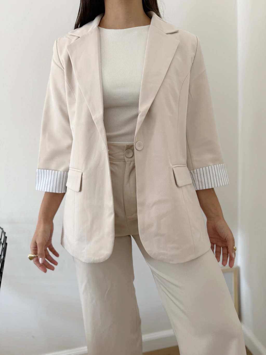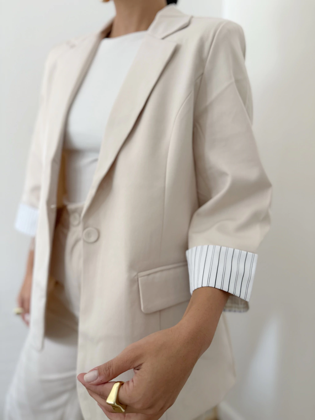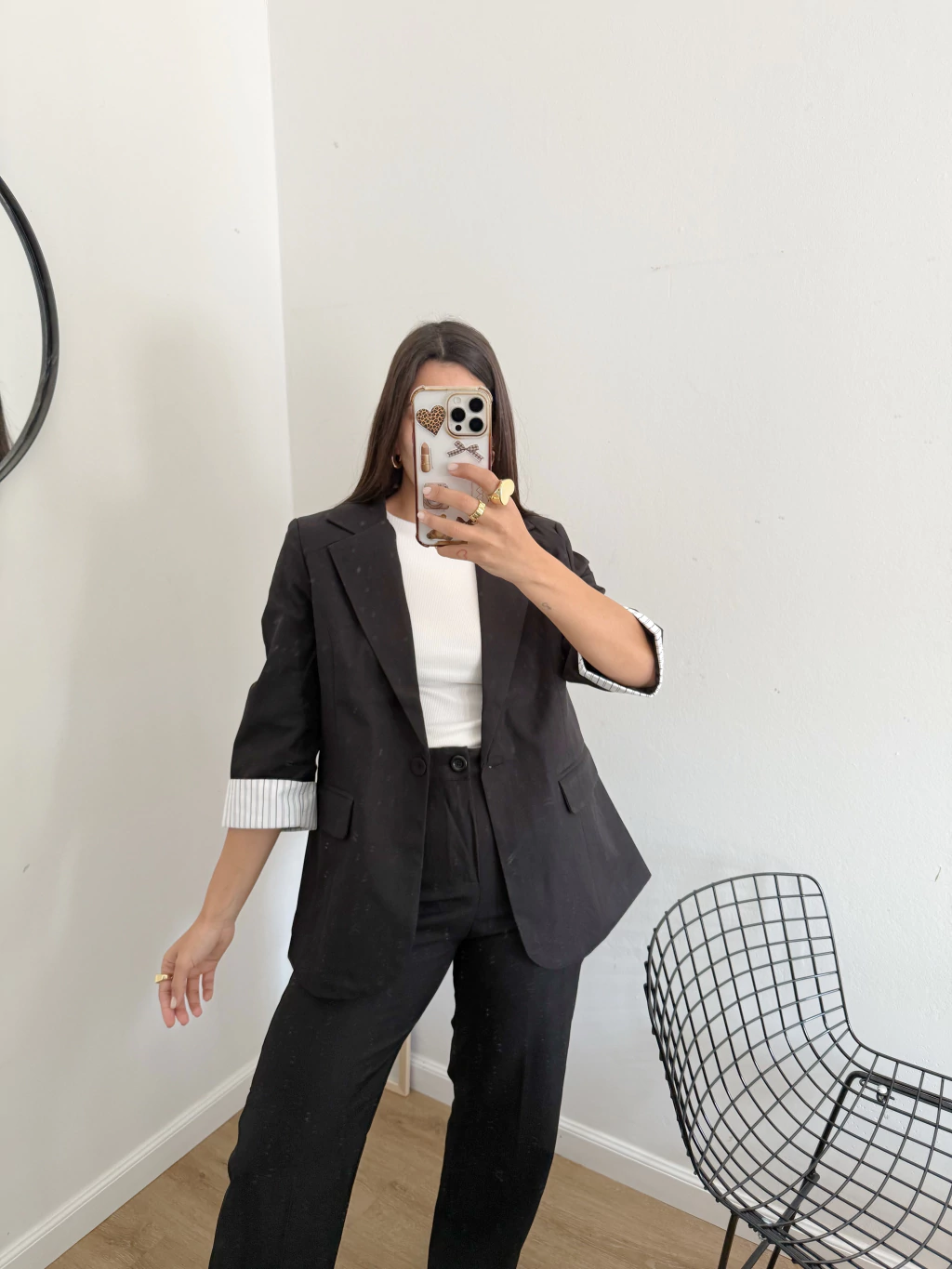 Una prenda elegante y versátil que no puede faltar en tu guardarropa. Con hombreras que realzan tu figura y mangas dobladas que aportan un toque moderno, este blazer se cierra con un botón central que define un look sofisticado y perfecto para cualquier ocasión.