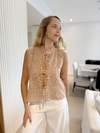 Camisa rayada 100% algodón con apliques de hotfix en toda la prenda. Cierre frontal con botones y bajo irregular que aporta un toque moderno y distintivo.