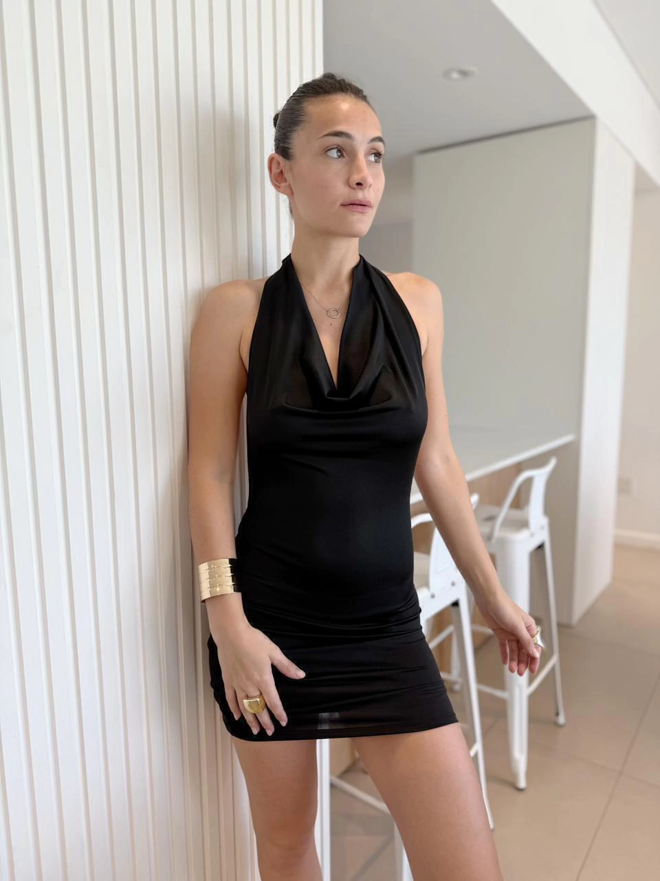 Este vestido de lycra destaca por su espalda totalmente descubierta y su tira para atar en la parte superior, que permite ajustar el calce a gusto. Los frunces a los costados estilizan la silueta y agregan un toque moderno.